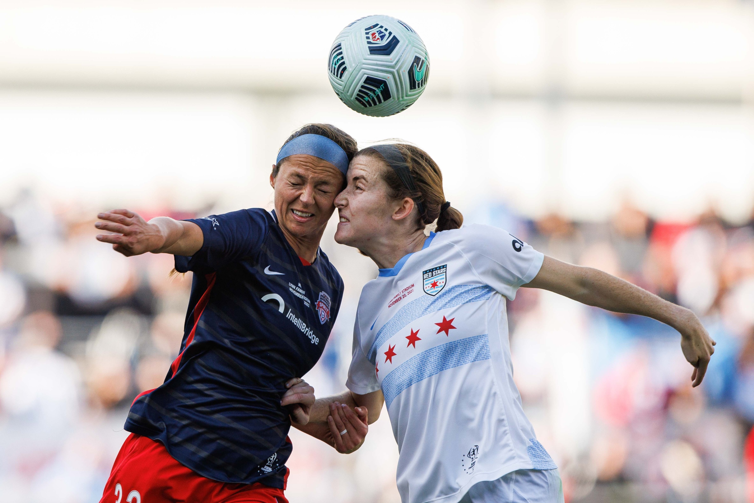 Nov 20, 2021; Louisville, Kentucky, USA; Washington Spirit forward Ashley Hatch (33) heads the ball against Chicago Red Stars defender Casey Krueger (6) during the NWSL Championship match at Lynn Family Stadium. Mandatory Credit: Jordan Prather-USA TODAY Sports
