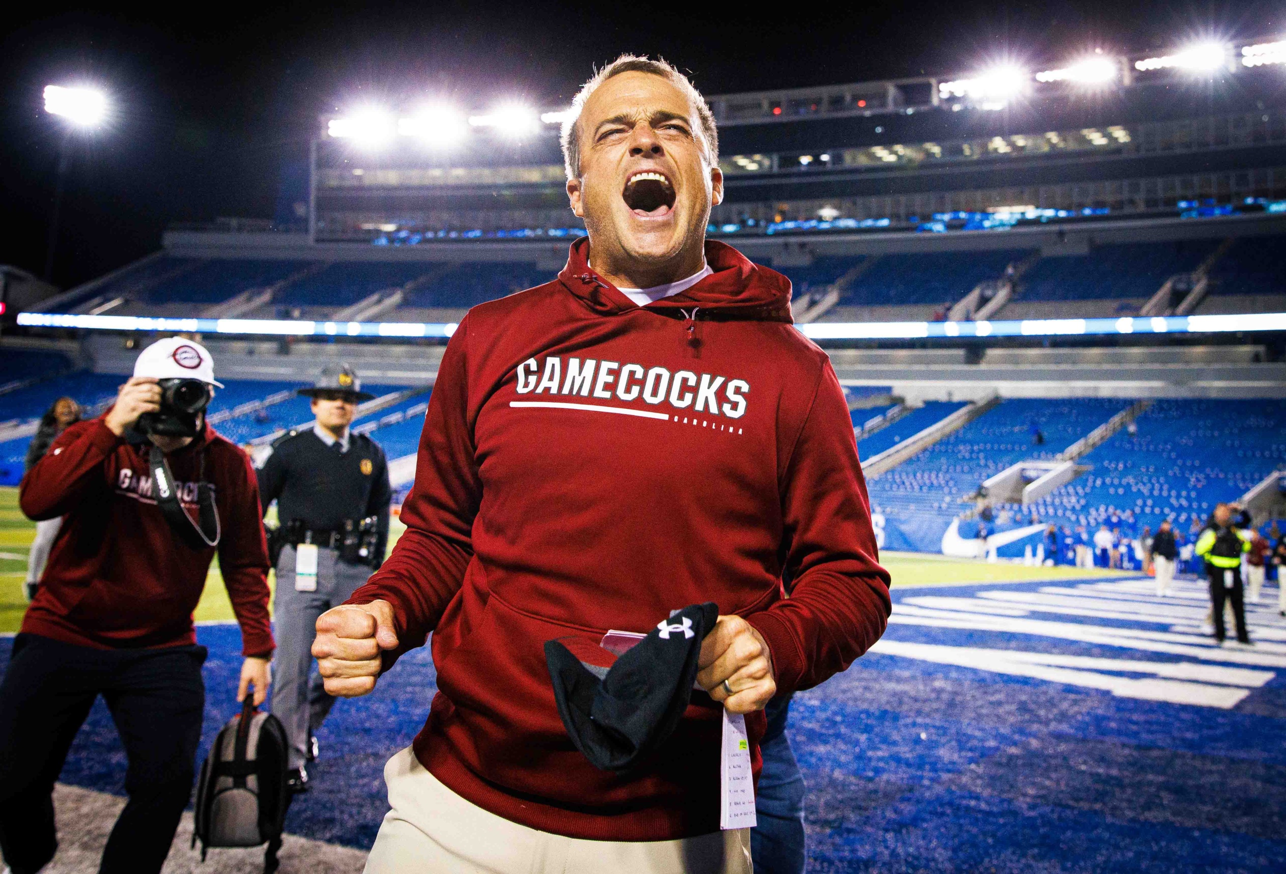 Oct 8, 2022; Lexington, Kentucky, USA; South Carolina Gamecocks head coach Shane Beamer celebrates after the game against the Kentucky Wildcats at Kroger Field. Jordan Prather-USA TODAY Sports
