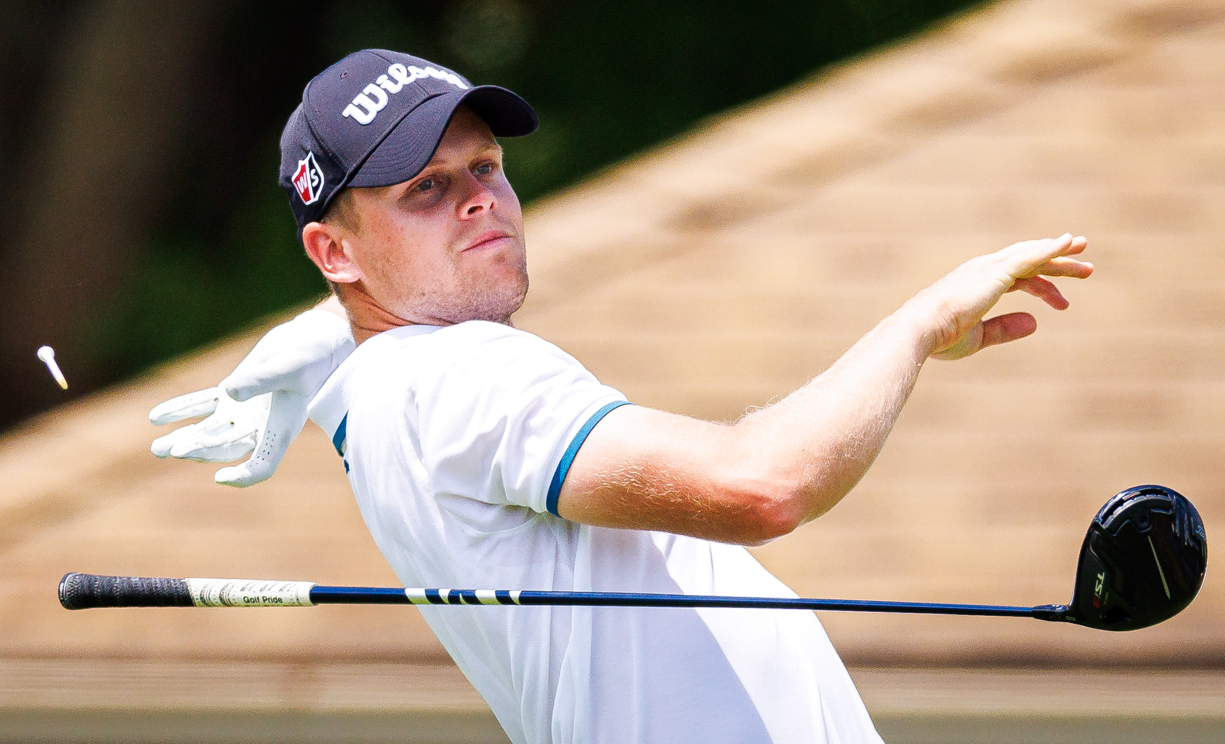 Jul 10, 2022; Nicholasville, Kentucky, USA; Hurly Long plays his shot from the fifth tee during the final round of the Barbasol Championship golf tournament. Jordan Prather-USA TODAY Sports