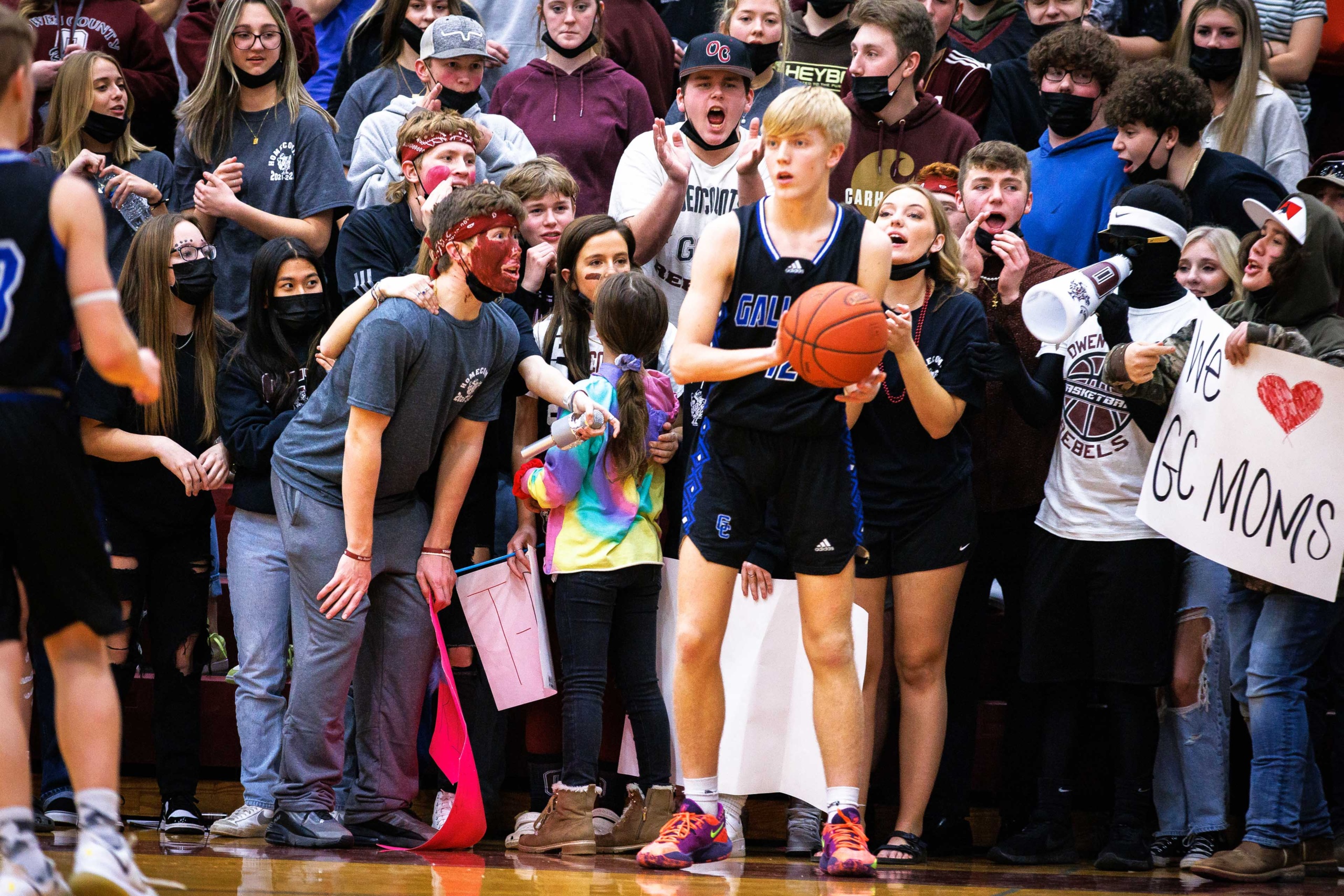 The Owen County student section attempts to distract a Gallatin County player during the game on Friday, Jan. 21, 2022, at Owen County High School in Owenton, Kentucky.