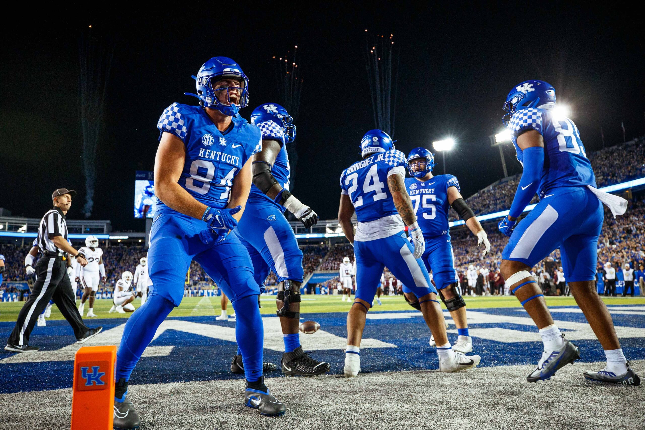 Oct 15, 2022; Lexington, Kentucky, USA; Kentucky Wildcats tight end Josh Kattus (84) celebrates after running back Chris Rodriguez Jr. (24) scores a touchdown during the fourth quarter against the Mississippi State Bulldogs at Kroger Field. Mandatory Credit: Jordan Prather-USA TODAY Sports