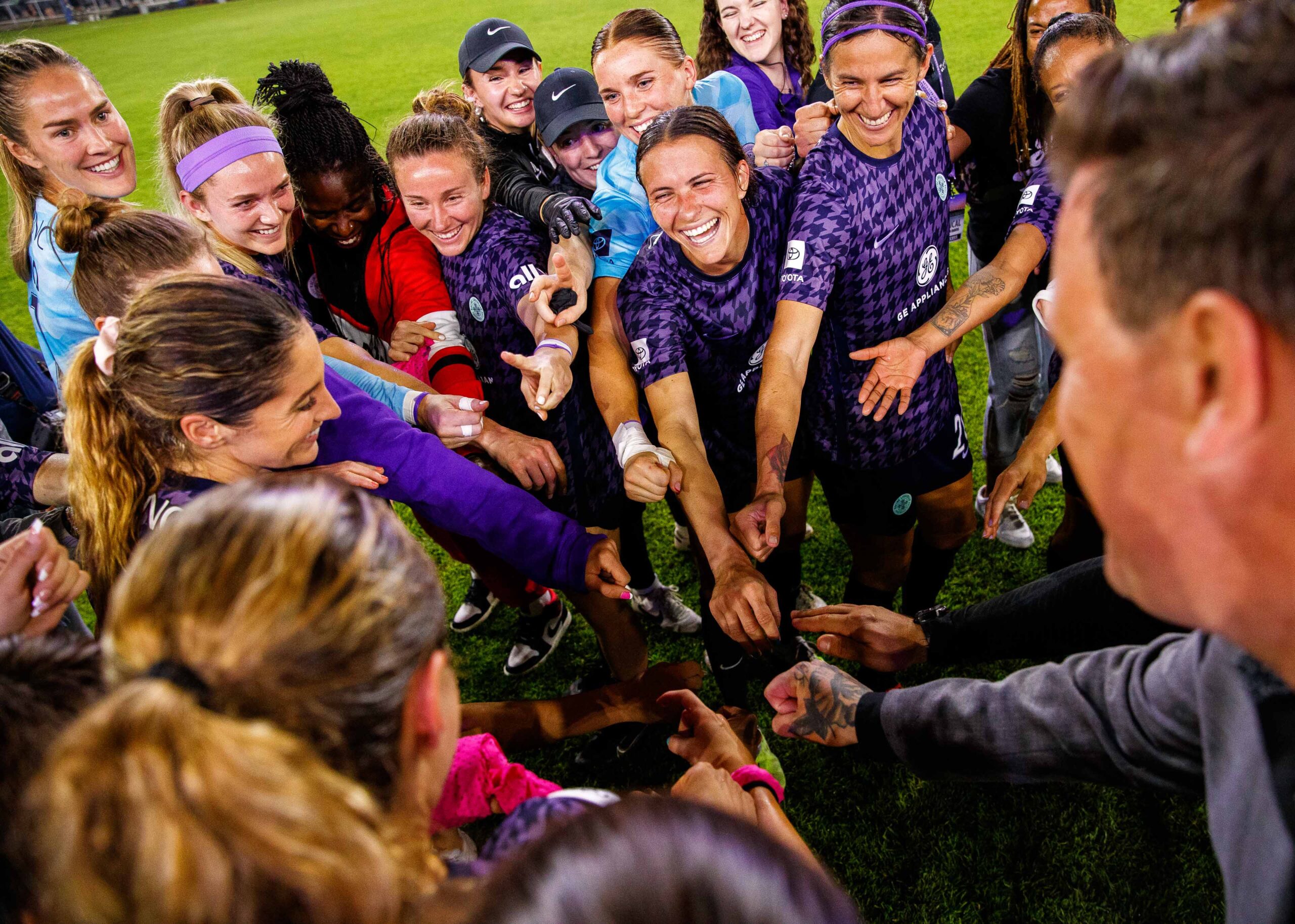 Racing Louisville players huddle up after winning the game against the Chicago Red Stars on Friday, May 12, at Lynn Family Stadium in Louisville, Kentucky