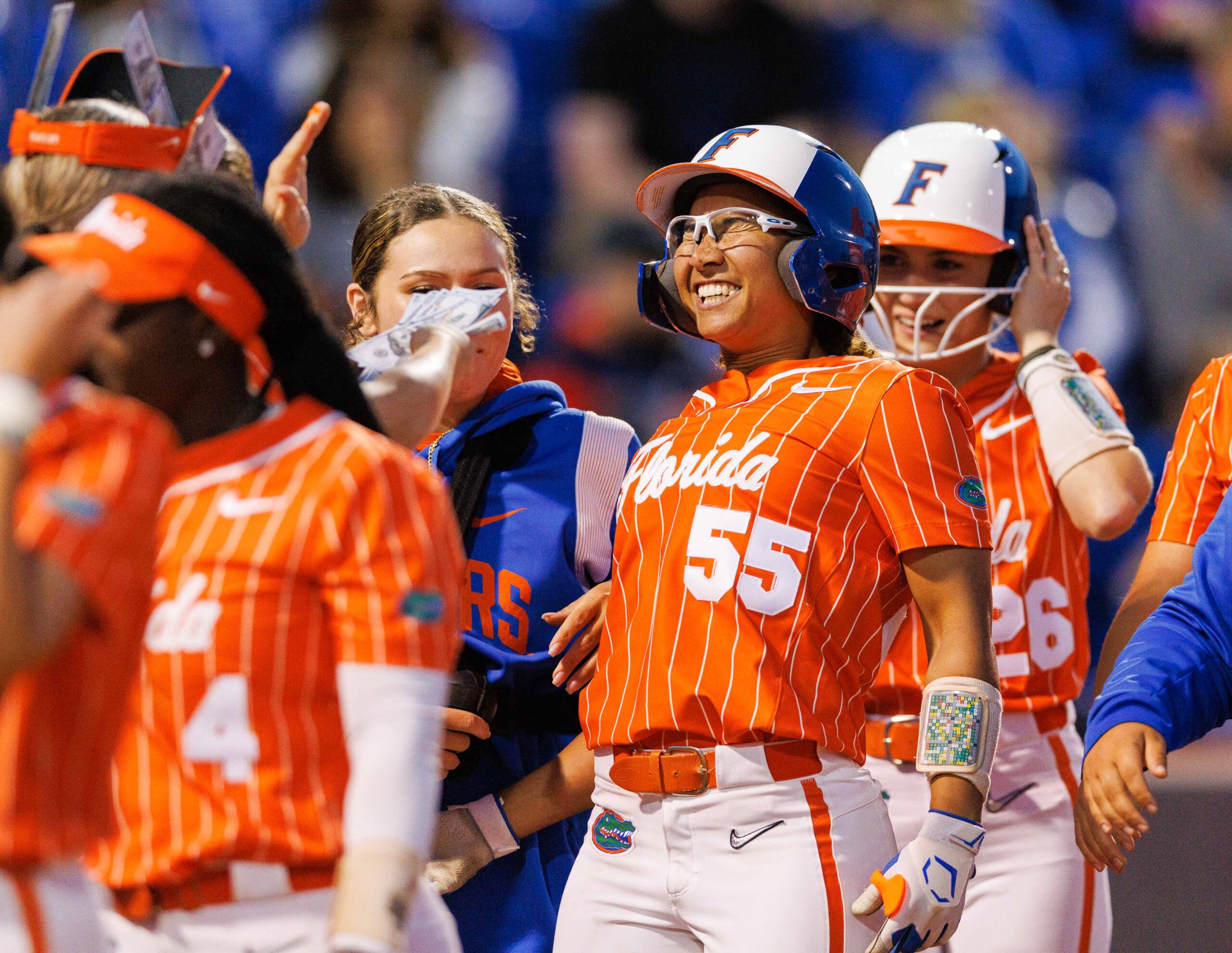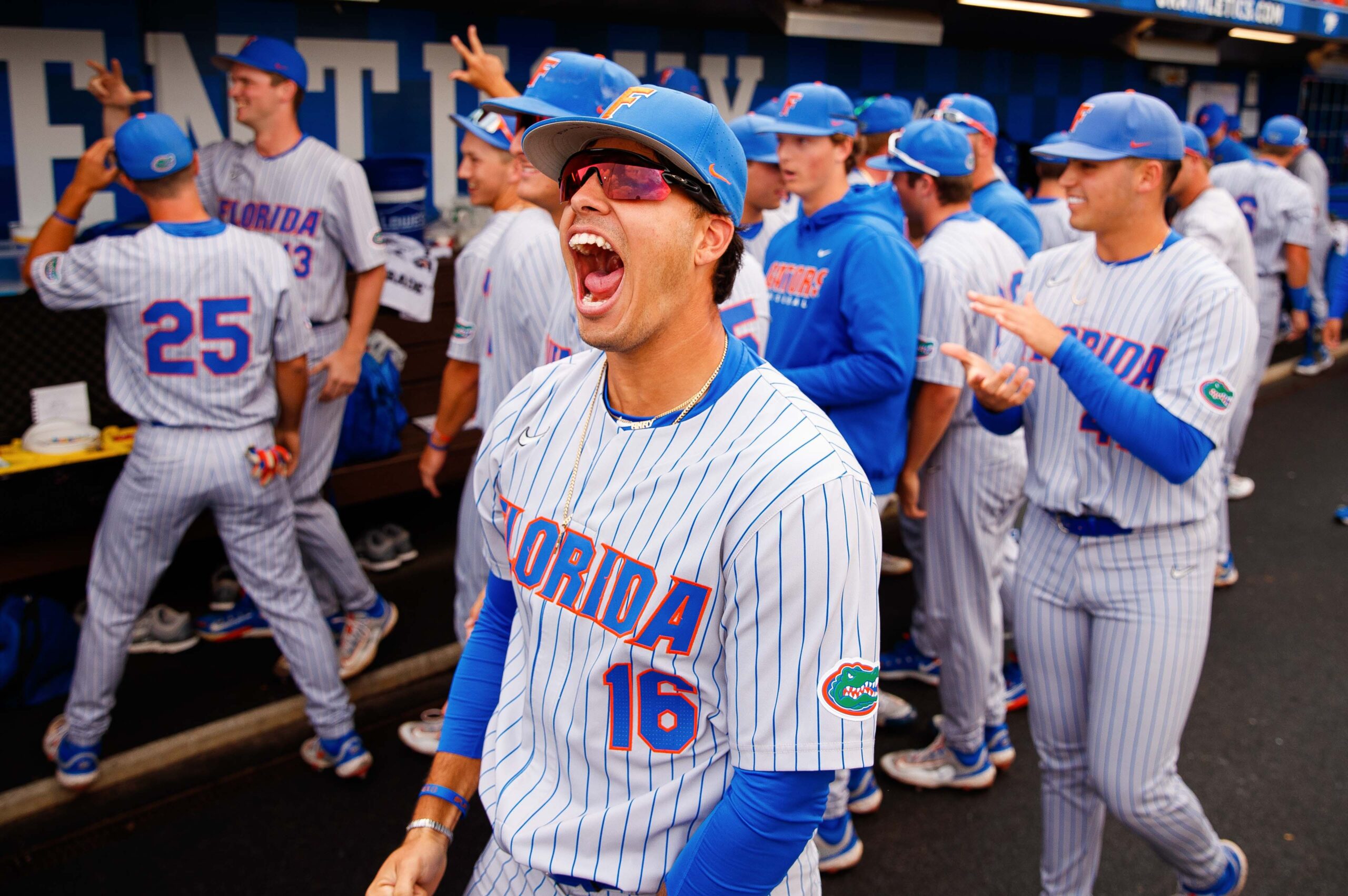 Florida Gators infielder Dale Thomas celebrates a run with teammates during the game against the Kentucky Wildcats on Saturday, May 20, 2023, at Kentucky Proud Park in Lexington, Kentucky.