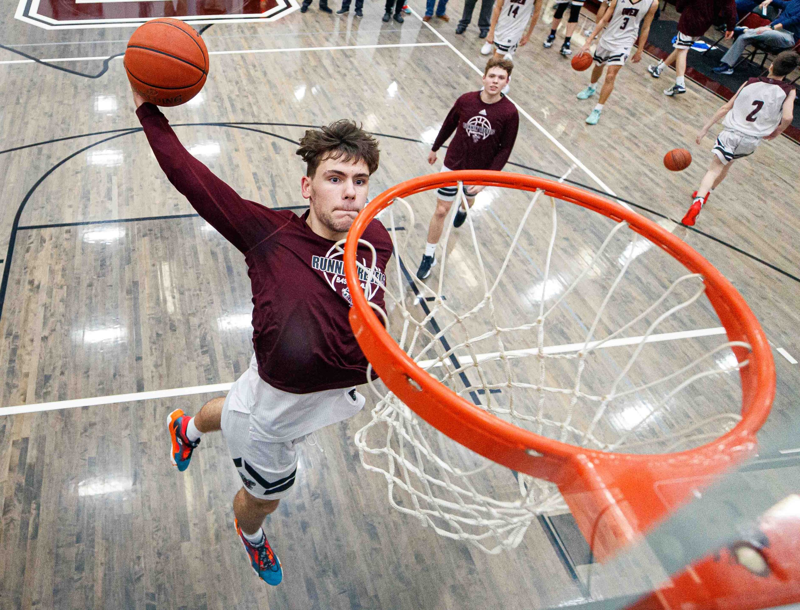 Owen County Runnin' Rebel Teagan Moore dunks the ball during warmups before the game against Simon Kenton at Owen County High School on Thursday, Feb. 16, in Owenton, Kentucky.