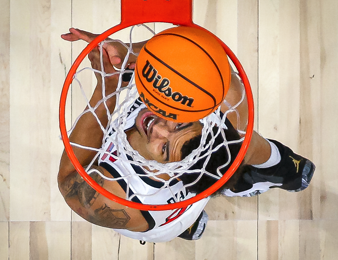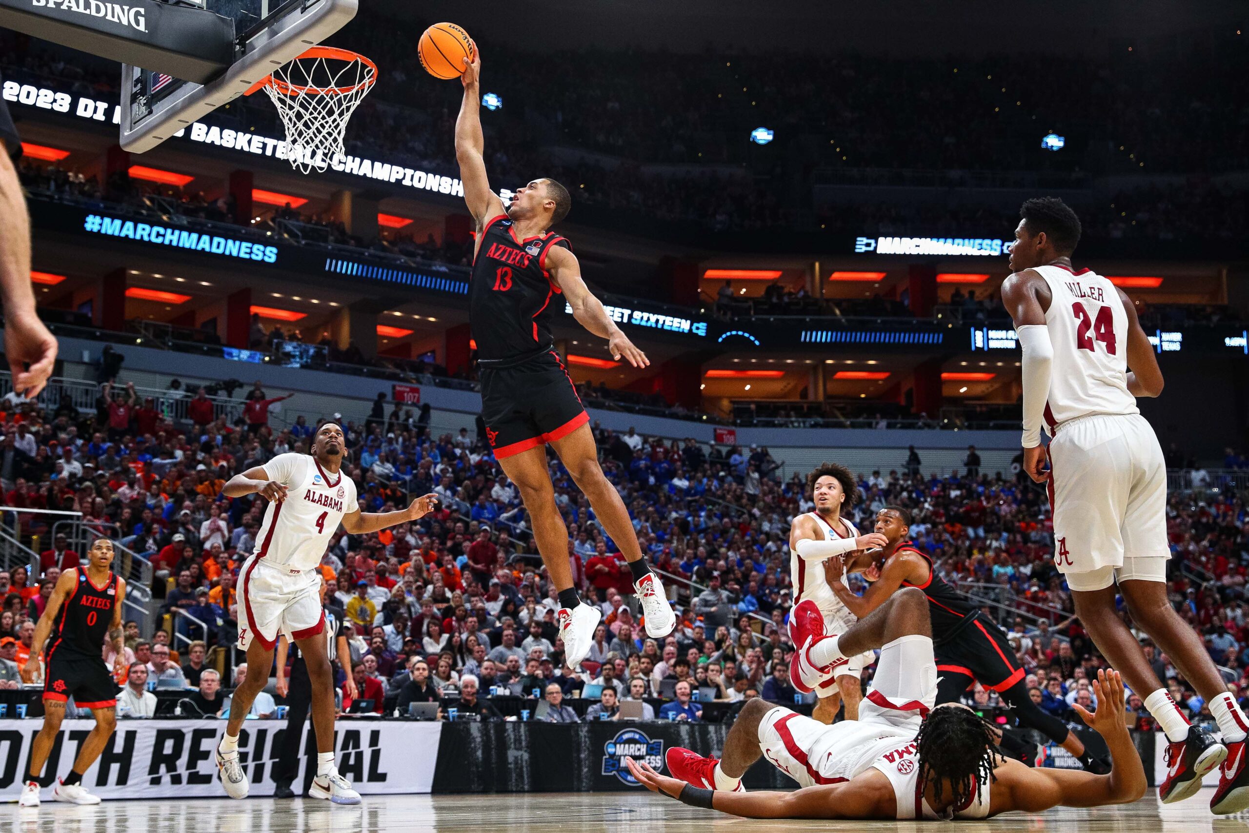 Mar 24, 2023; Louisville, KY, USA; San Diego State Aztecs forward Jaedon LeDee (13) dunks during the second half of the NCAA tournament round of sixteen against the Alabama Crimson Tide at KFC YUM! Center. Mandatory Credit: Jordan Prather-USA TODAY Sports