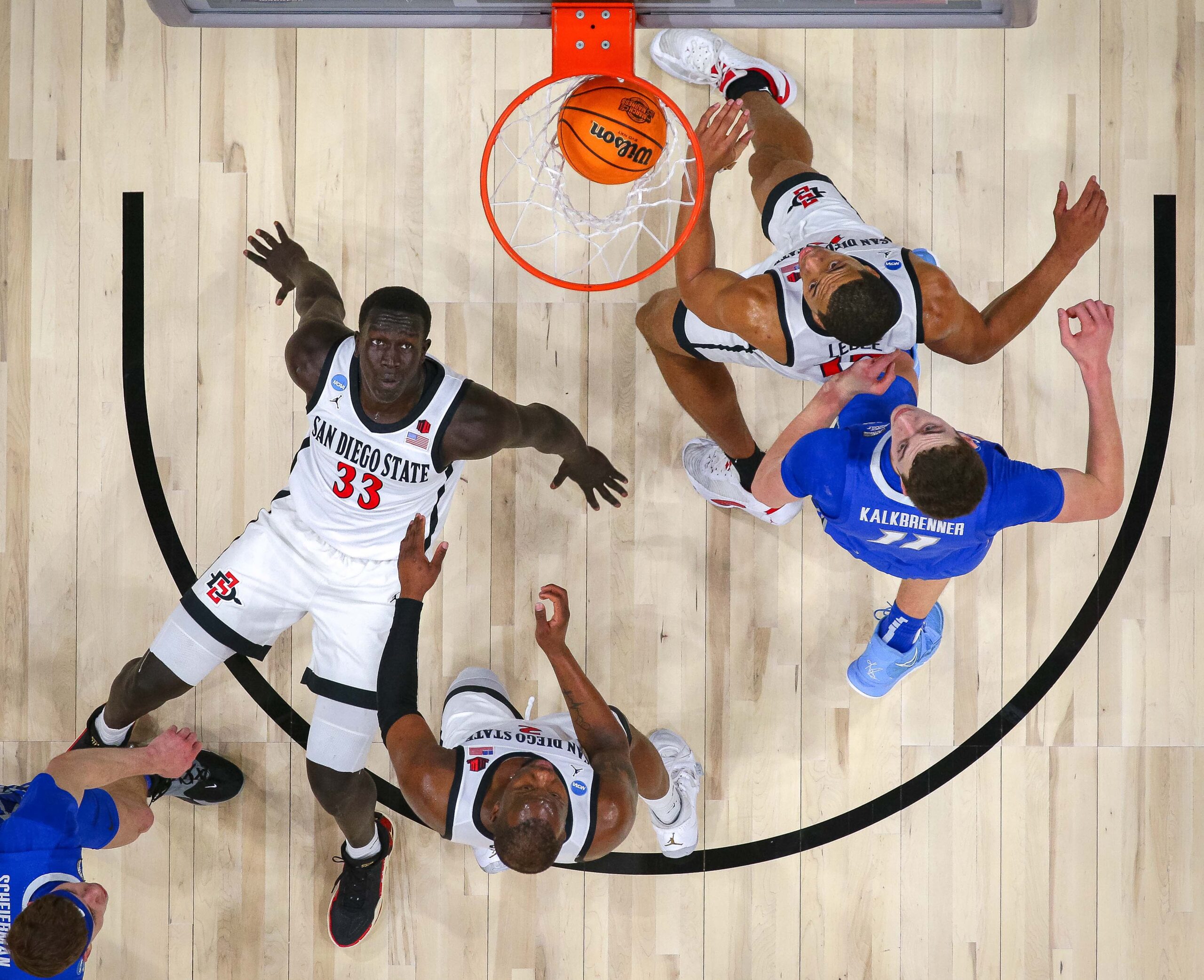 Mar 26, 2023; Louisville, KY, USA; Creighton Bluejays center Ryan Kalkbrenner (11) and San Diego State Aztecs forward Jaedon LeDee (13) go for the basket during the second half at the NCAA Tournament South Regional-Creighton vs San Diego State at KFC YUM! Center. Mandatory Credit: Jordan Prather-USA TODAY Sports