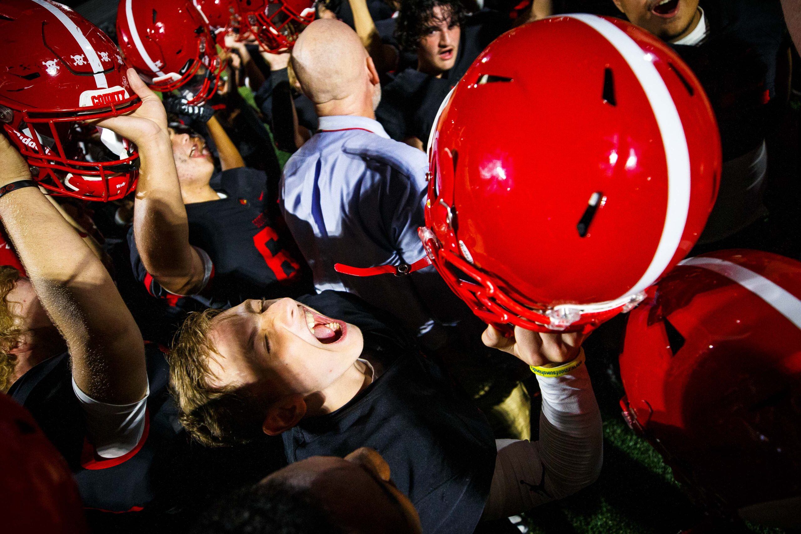The Scott County Cardinals huddle up after the game against the Bryan Station Defenders on Friday, Sept. 9, 2022, at Great Crossing High School in Georgetown, Kentucky.