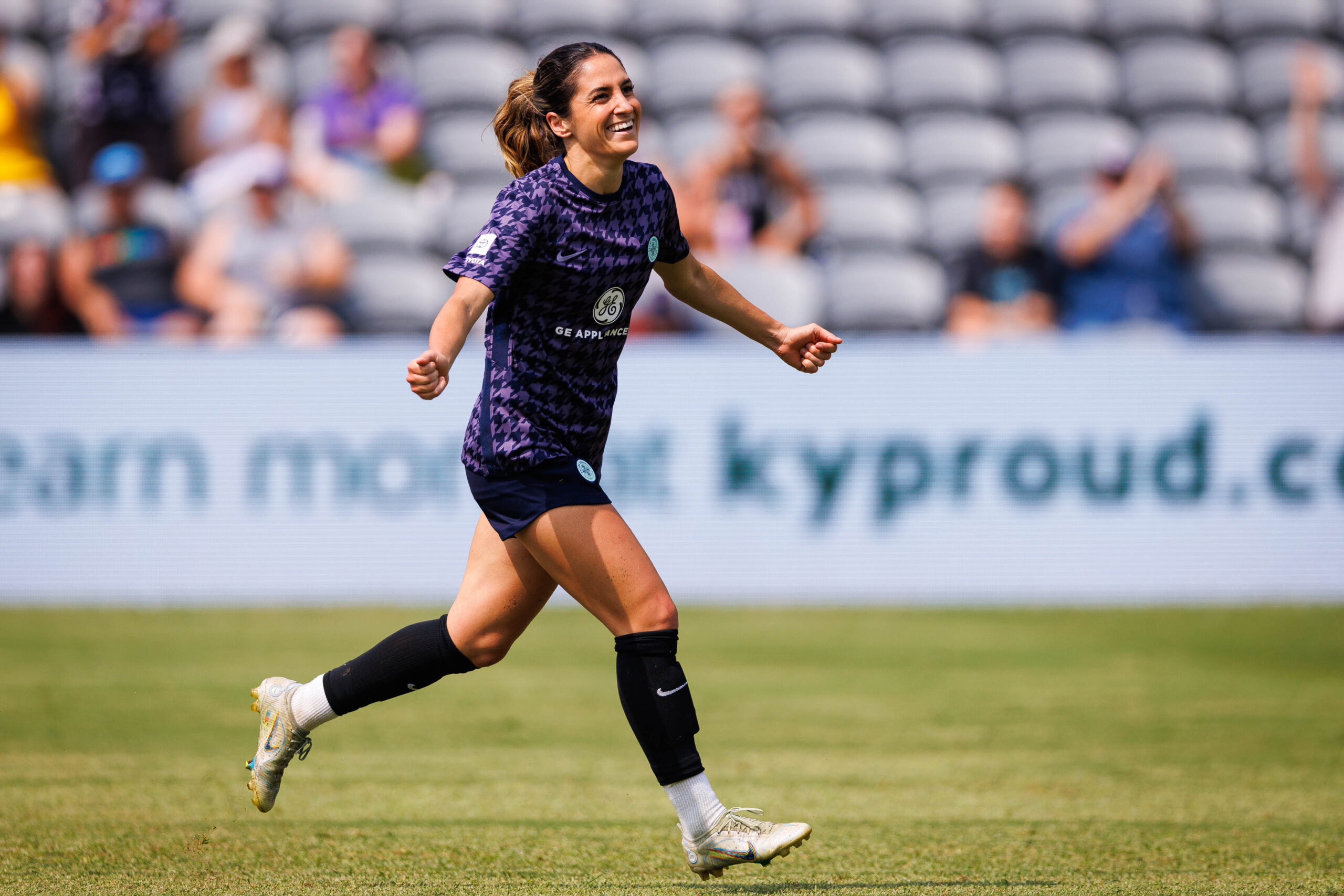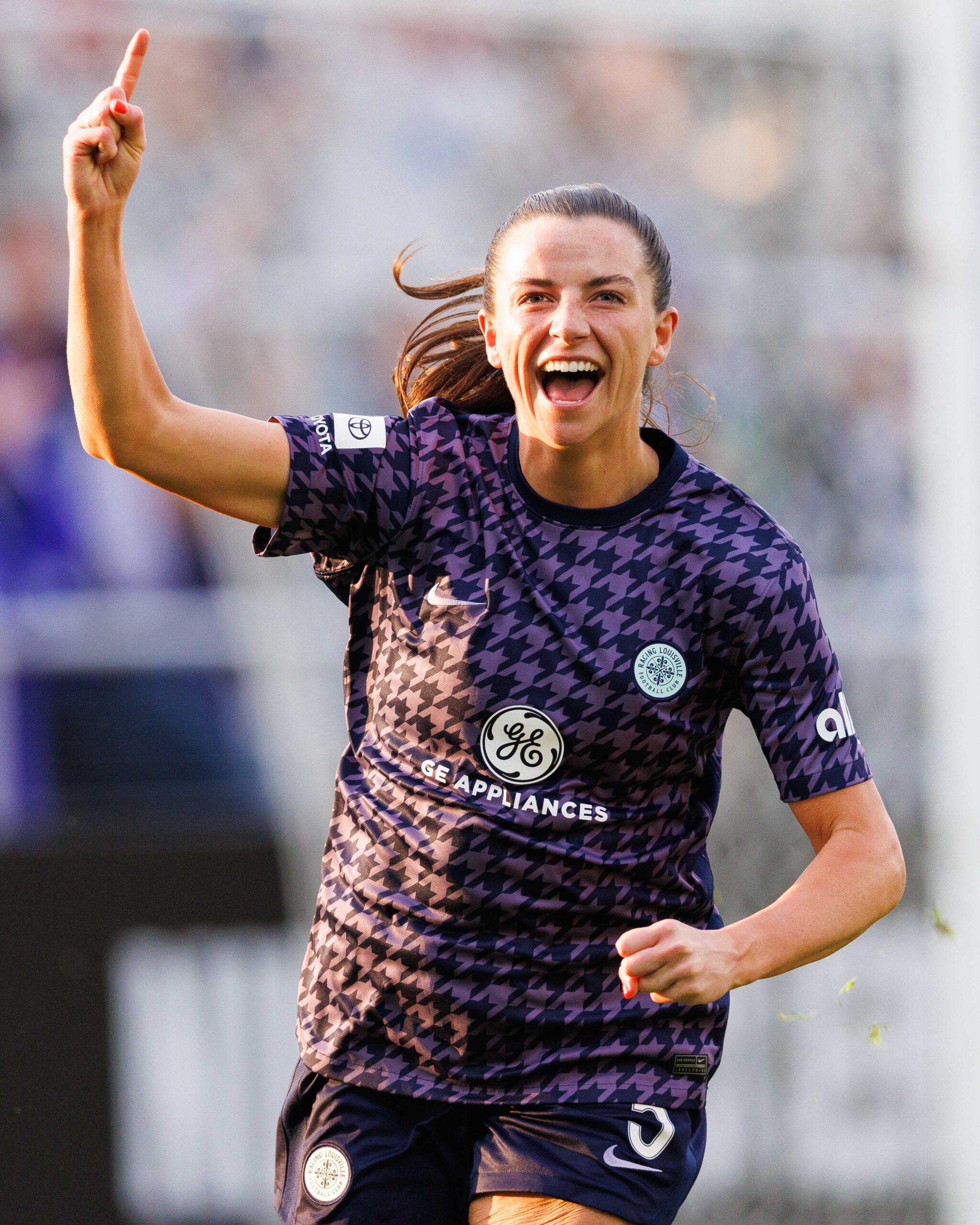 Racing Louisville defender Paige Monaghan celebrates a goal during the game against OL Reign on Saturday, April 29, at Lynn Family Stadium in Louisville, Kentucky