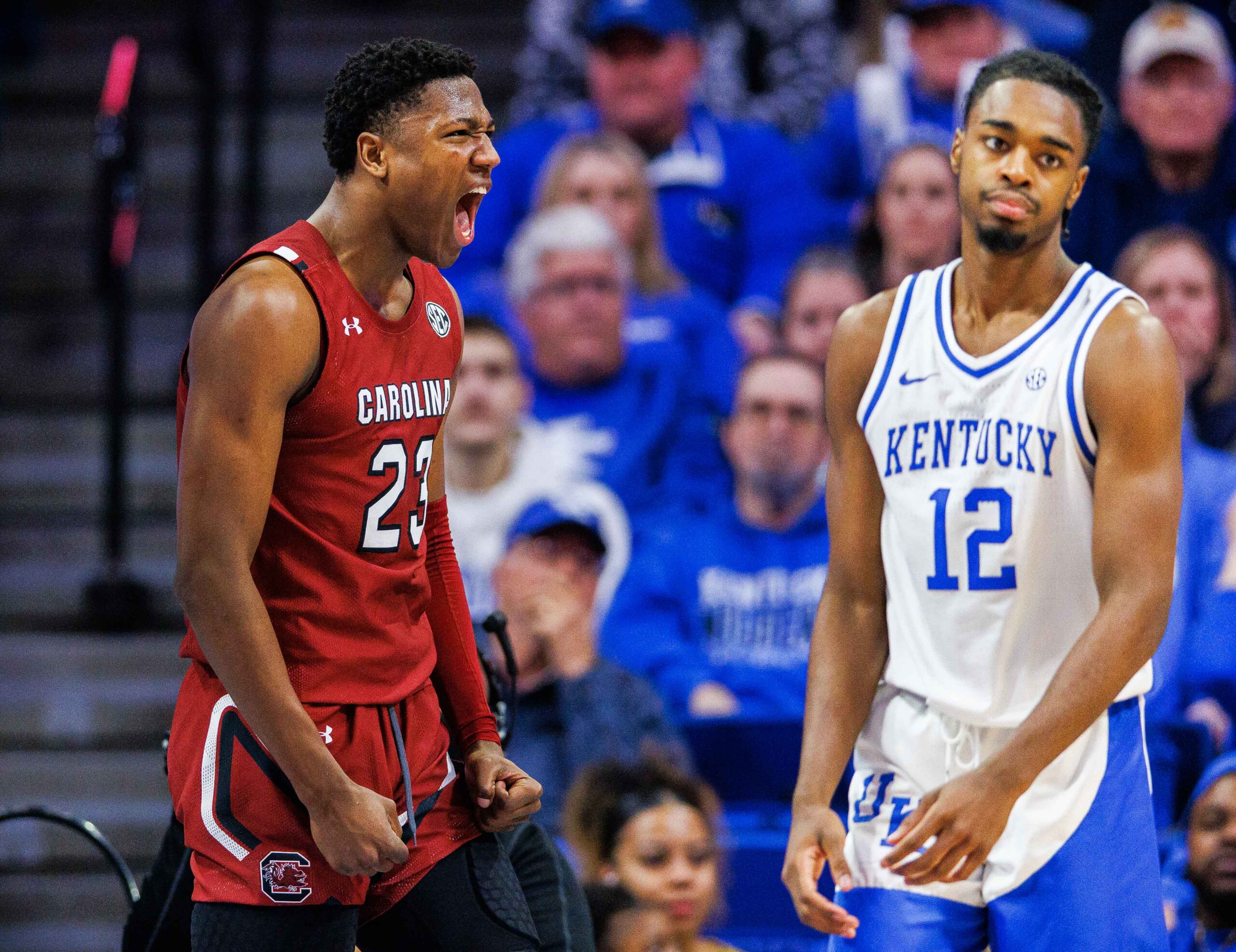 Jan 10, 2023; Lexington, Kentucky, USA; South Carolina Gamecocks forward Gregory Jackson II (23) celebrates during the second half against the Kentucky Wildcats at Rupp Arena at Central Bank Center. Mandatory Credit: Jordan Prather-USA TODAY Sports
