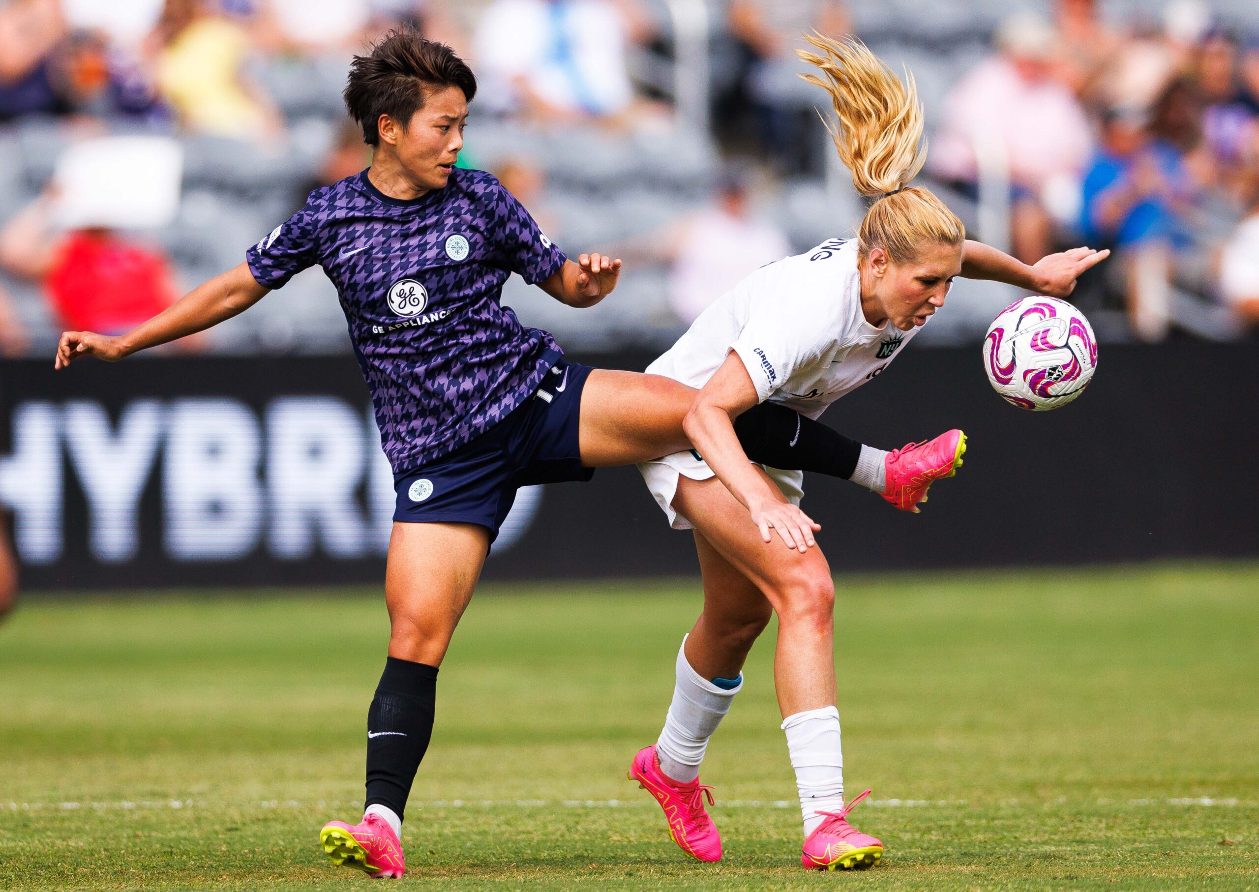 Racing Louisville midfielder Wang Shuang and Gotham FC midfielder Allie Long jostle for possession during the game on Sunday, June 18, 2023, at Lynn Family Stadium in Louisville, Kentucky.