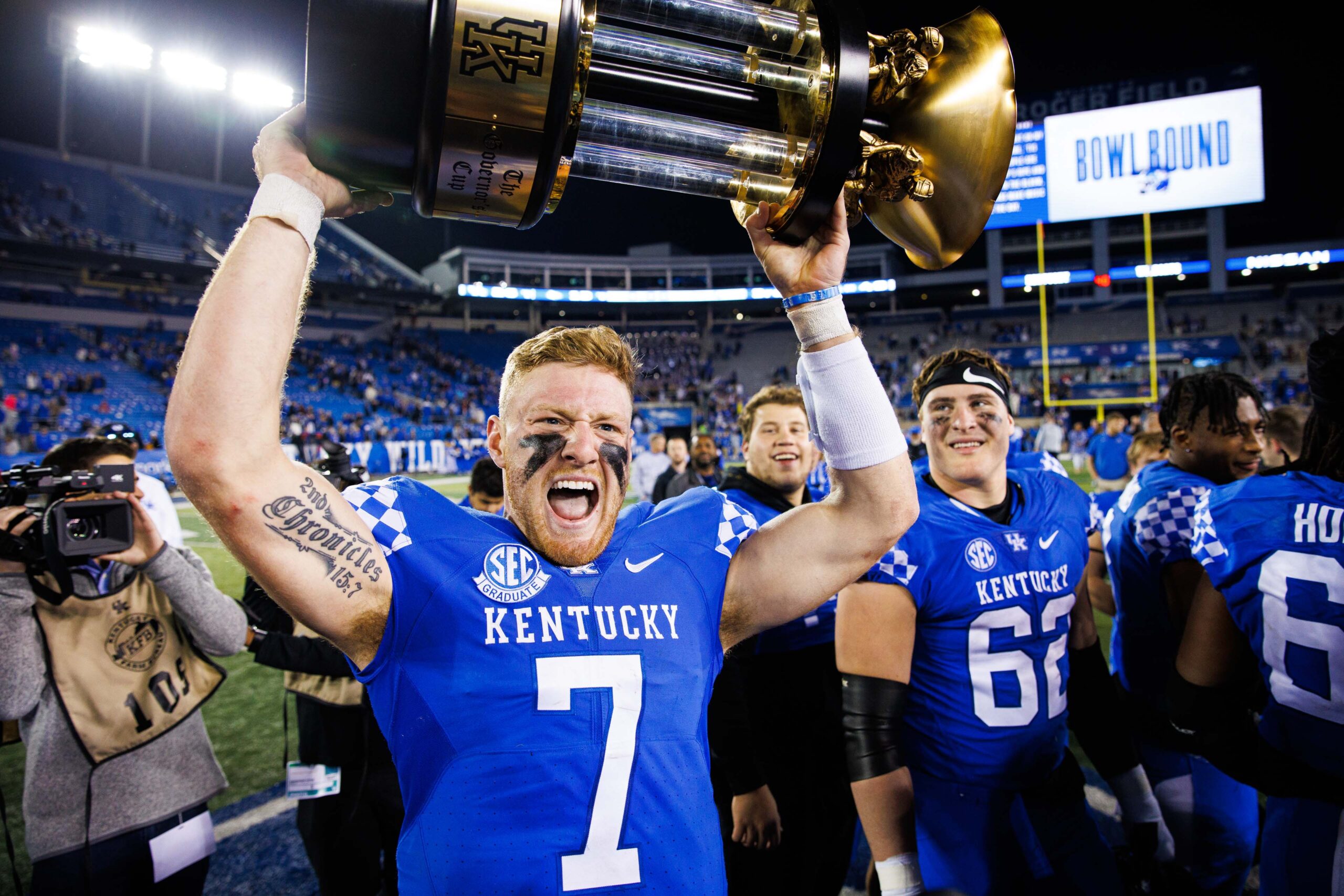 Nov 26, 2022; Lexington, Kentucky, USA; Kentucky Wildcats quarterback Will Levis (7) holds up the Governor’s Cup trophy after winning the game against the Louisville Cardinals at Kroger Field. Mandatory Credit: Jordan Prather-USA TODAY Sports