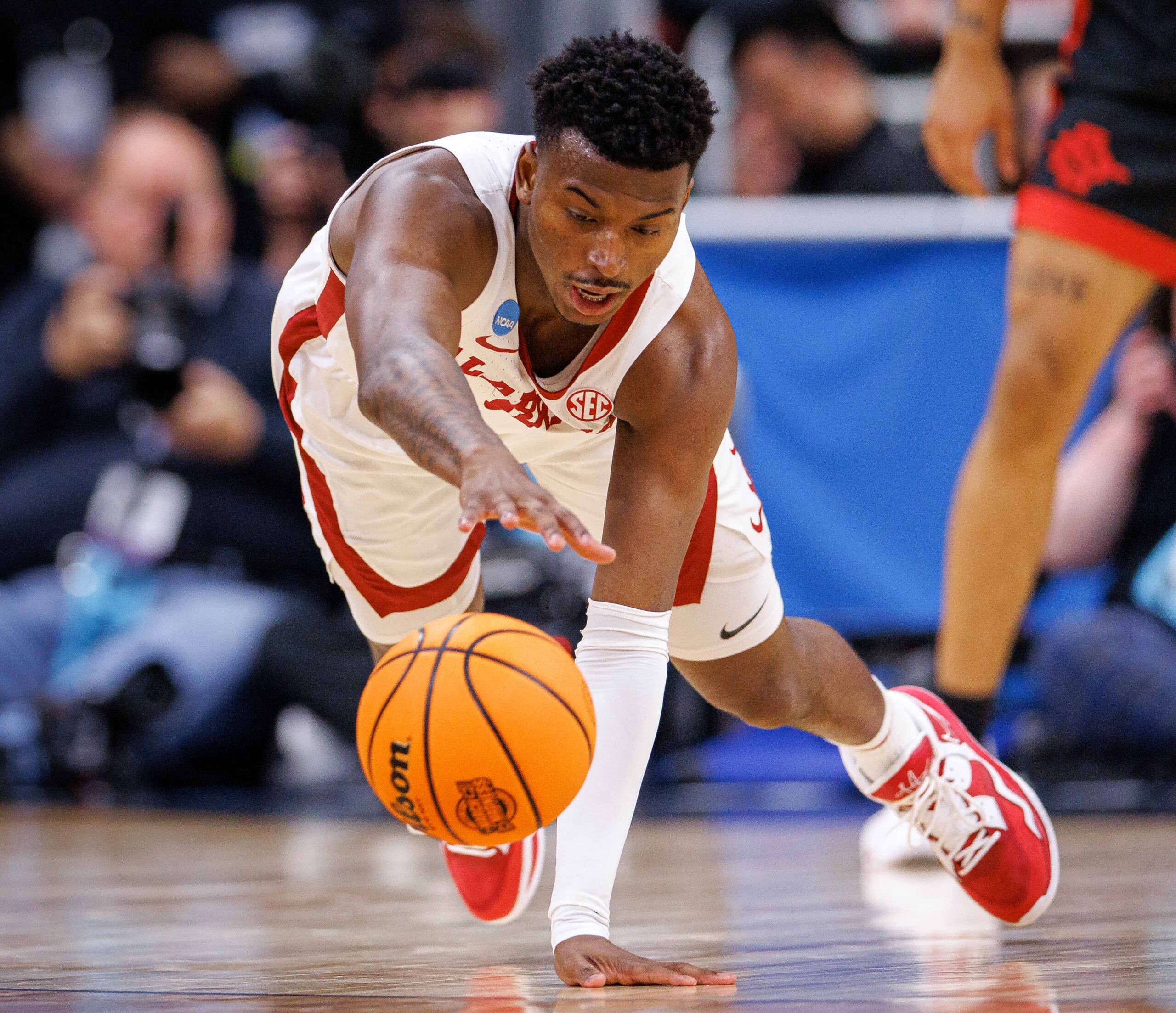 Mar 24, 2023; Louisville, KY, USA; Alabama Crimson Tide guard Jaden Bradley (0) dives for a loose ball during the first half of the NCAA tournament round of sixteen at KFC YUM! Center. Mandatory Credit: Jordan Prather-USA TODAY Sports