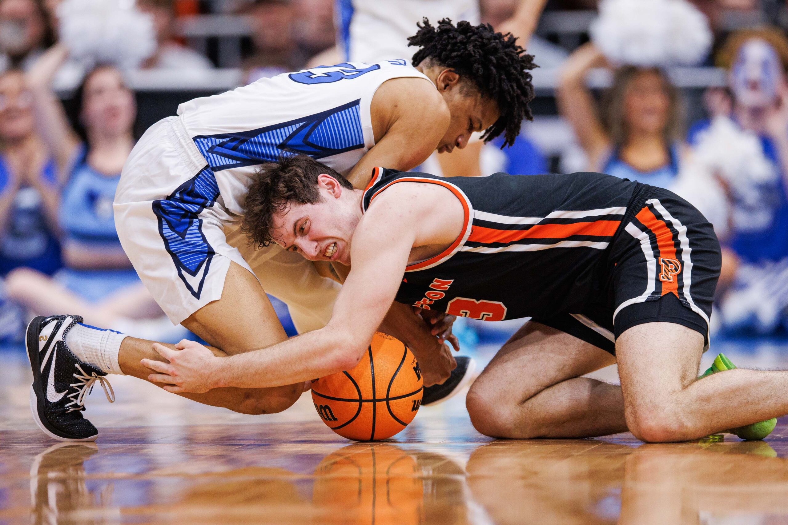 Mar 24, 2023; Louisville, KY, USA; Princeton Tigers guard Ryan Langborg (3) and Creighton Bluejays guard Trey Alexander (23) battle for a loose ball during the second half of the NCAA tournament round of sixteen at KFC YUM! Center. Mandatory Credit: Jordan Prather-USA TODAY Sports
