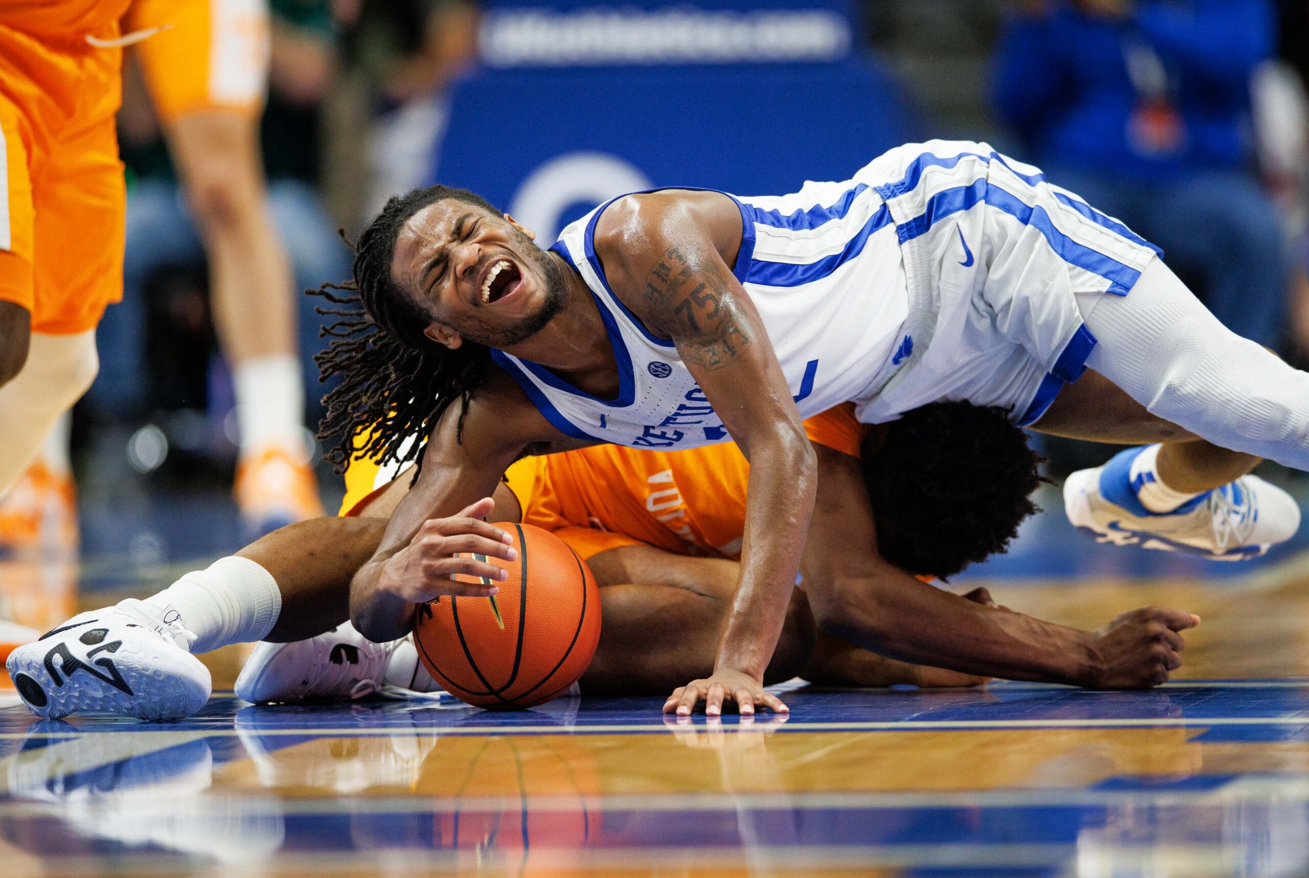 Feb 18, 2023; Lexington, Kentucky, USA; Kentucky Wildcats guard Cason Wallace (22) dives for the ball over Tennessee Volunteers forward Tobe Awaka (11) during the first half at Rupp Arena at Central Bank Center. Mandatory Credit: Jordan Prather-USA TODAY Sports