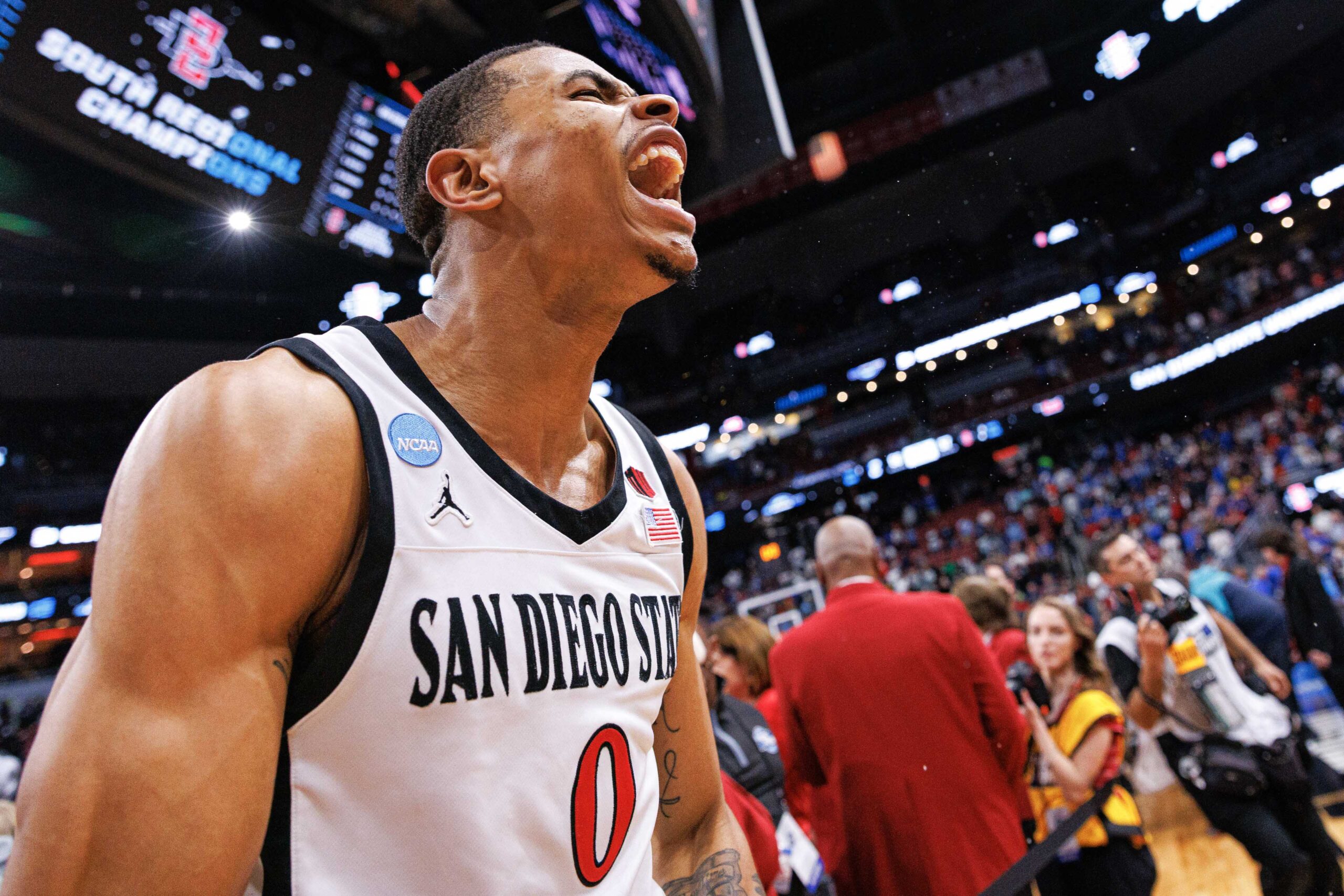 Mar 26, 2023; Louisville, KY, USA; San Diego State Aztecs forward Keshad Johnson (0) reacts to the win against Creighton Bluejays at the NCAA Tournament South Regional-Creighton vs San Diego State at KFC YUM! Center. Mandatory Credit: Jordan Prather-USA TODAY Sports
