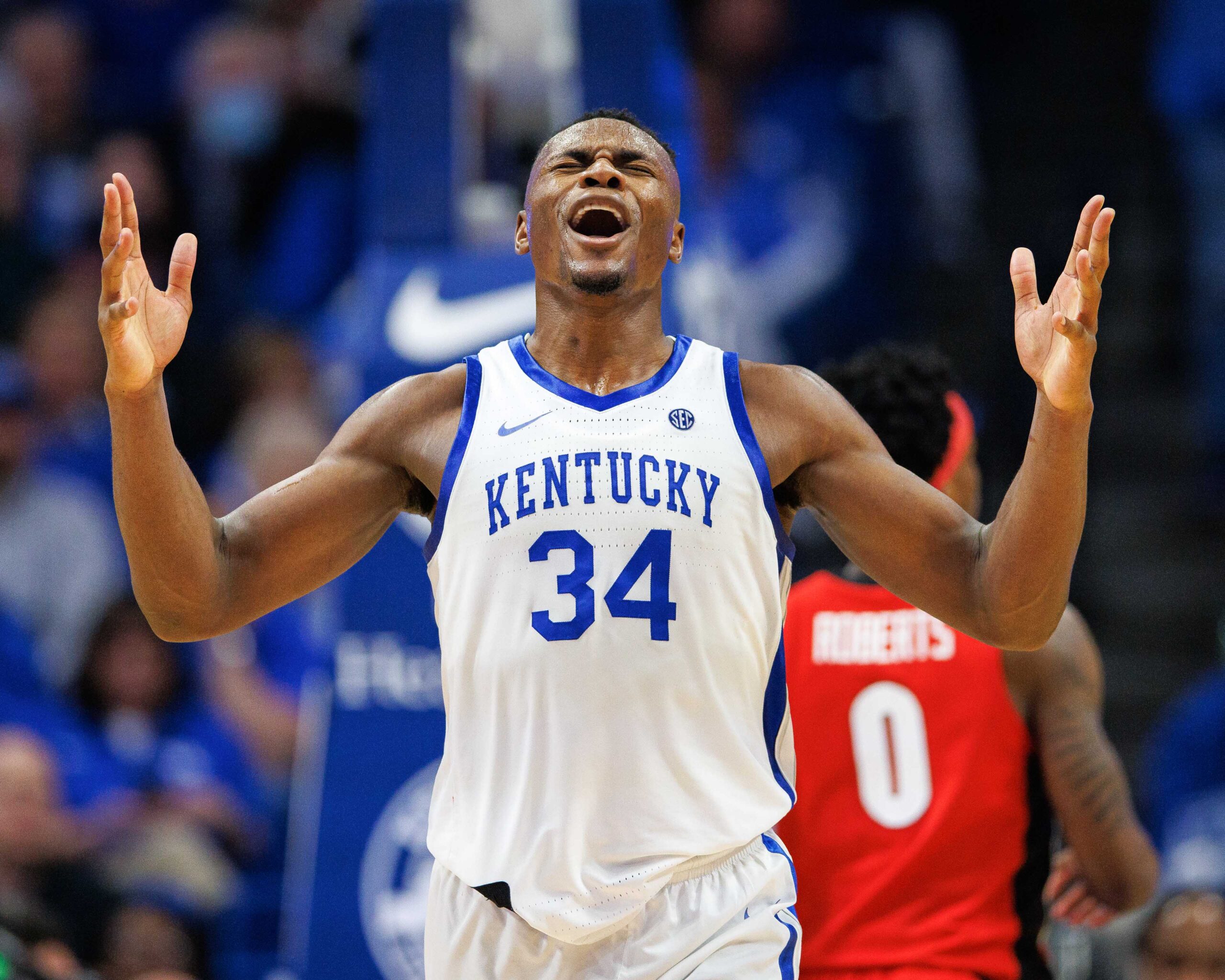 Jan 17, 2023; Lexington, Kentucky, USA; Kentucky Wildcats forward Oscar Tshiebwe (34) reacts to a call during the second half against the Georgia Bulldogs at Rupp Arena at Central Bank Center. Mandatory Credit: Jordan Prather-USA TODAY Sports