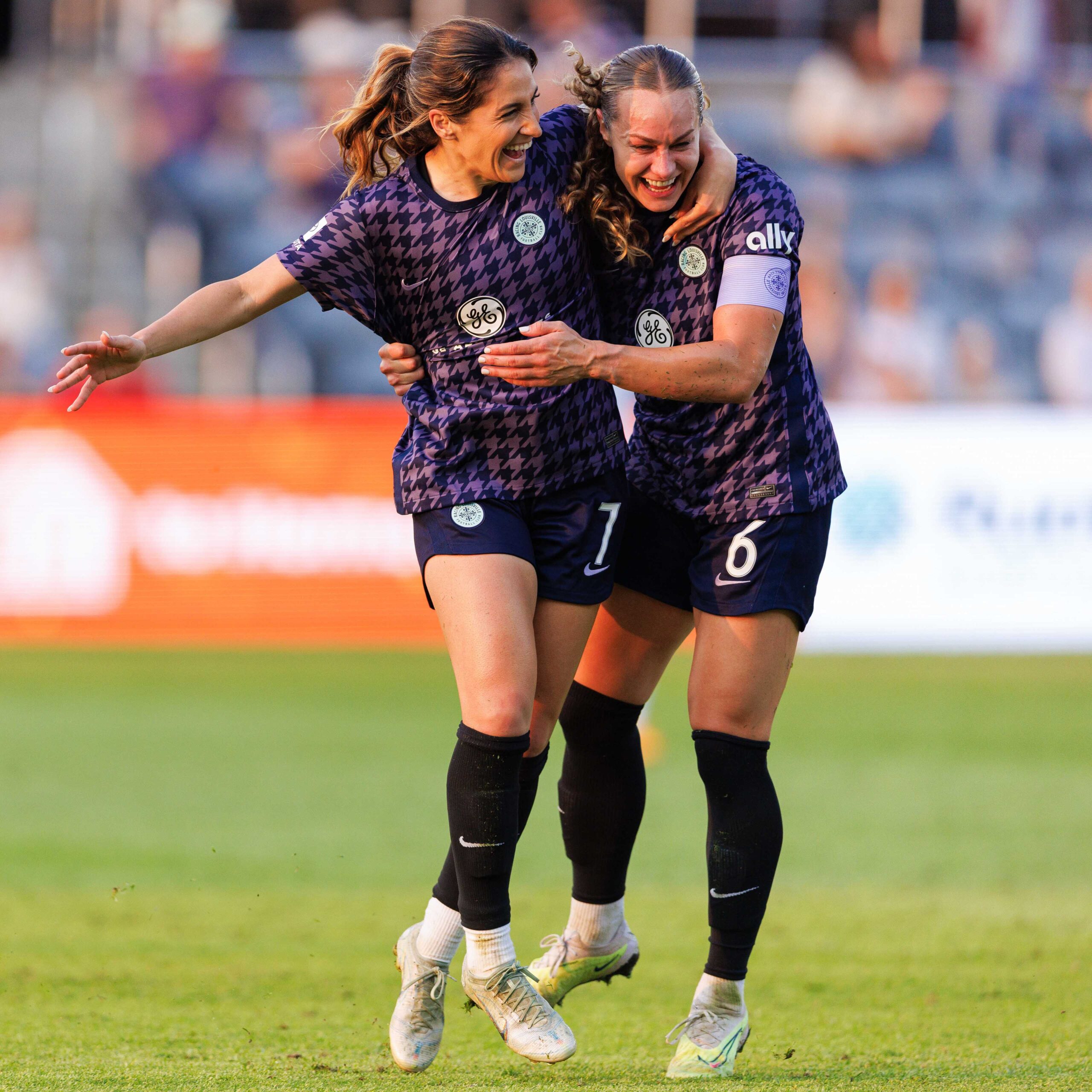 Racing Louisville midfielder Savannah DeMelo celebrates a goal with midfielder Jaelin Howell during the game against KC Current on Wednesday, May 17, at Lynn Family Stadium in Louisville, Kentucky