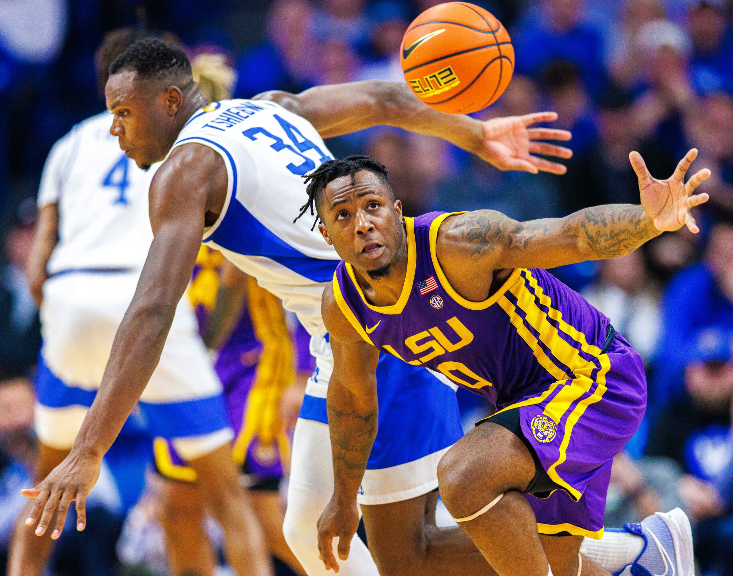 Jan 3, 2023; Lexington, Kentucky, USA; LSU Tigers guard Trae Hannibal (0) chases down a loose ball during the first half against the Kentucky Wildcats at Rupp Arena at Central Bank Center. Mandatory Credit: Jordan Prather-USA TODAY Sports