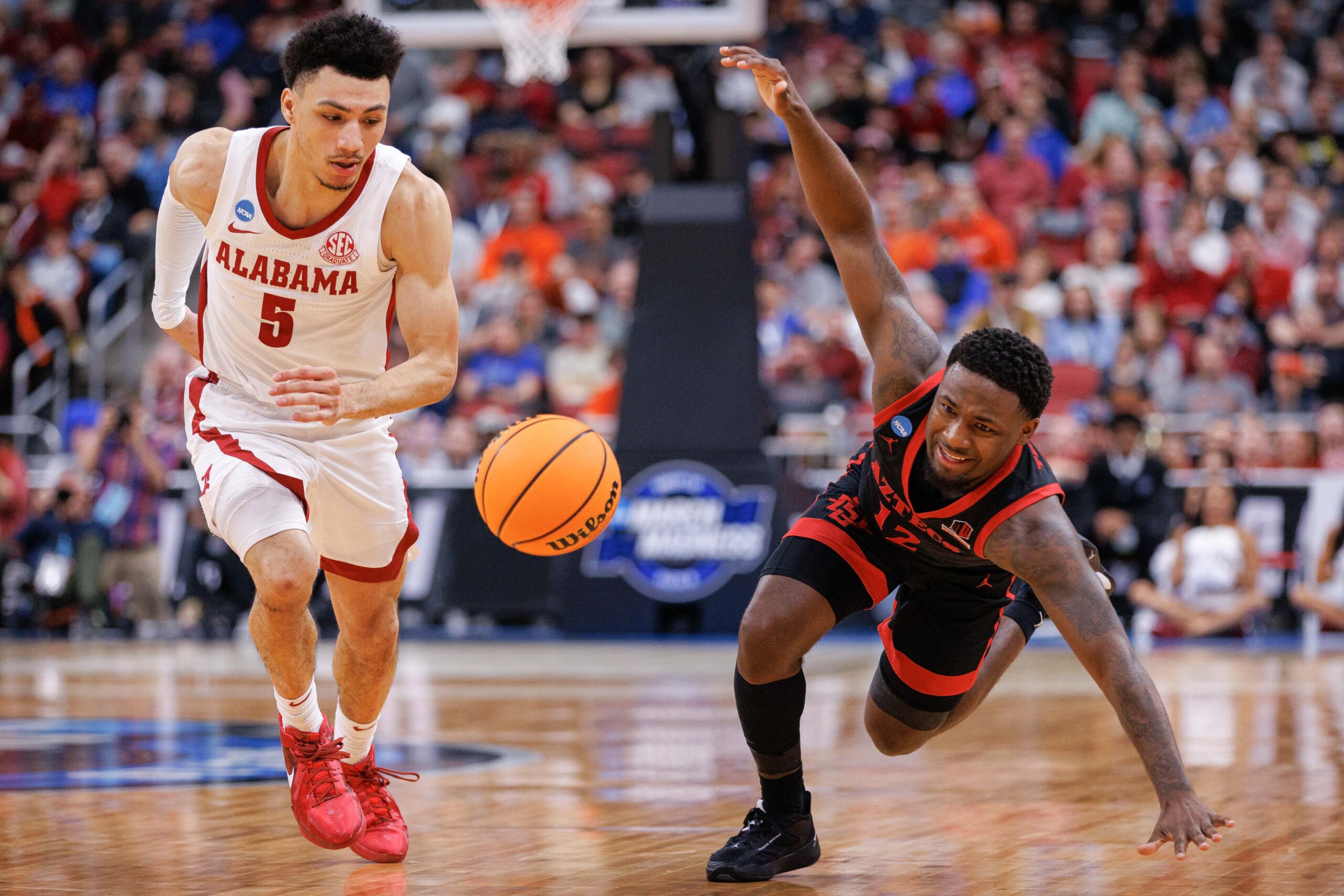Mar 24, 2023; Louisville, KY, USA; San Diego State Aztecs guard Darrion Trammell (12) and Alabama Crimson Tide guard Jahvon Quinerly (5) chase a loose ball during the second half of the NCAA tournament round of sixteen at KFC YUM! Center. Mandatory Credit: Jordan Prather-USA TODAY Sports