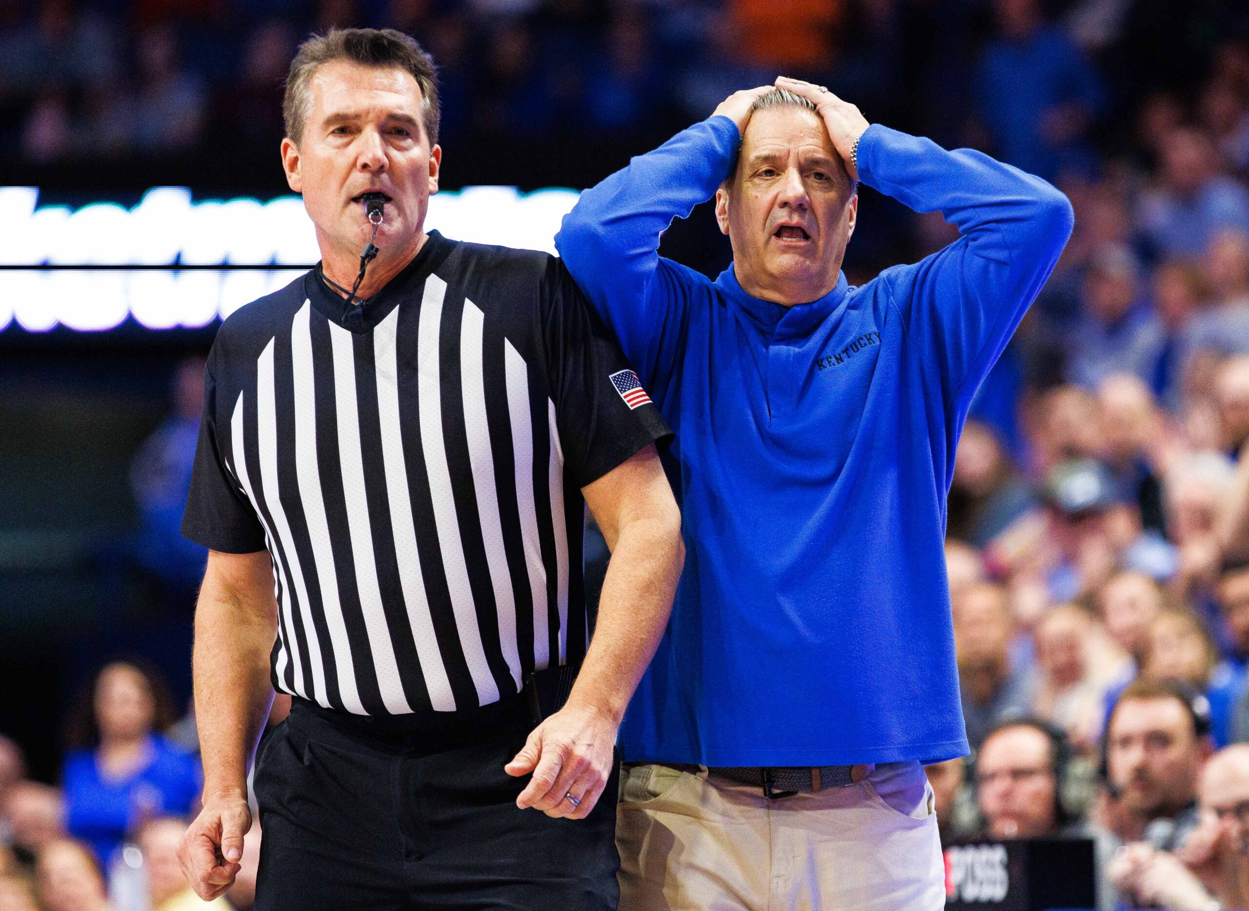 Jan 3, 2023; Lexington, Kentucky, USA; Kentucky Wildcats head coach John Calipari reacts next to referee Doug Shows during the second half against the LSU Tigers at Rupp Arena at Central Bank Center. Mandatory Credit: Jordan Prather-USA TODAY Sports