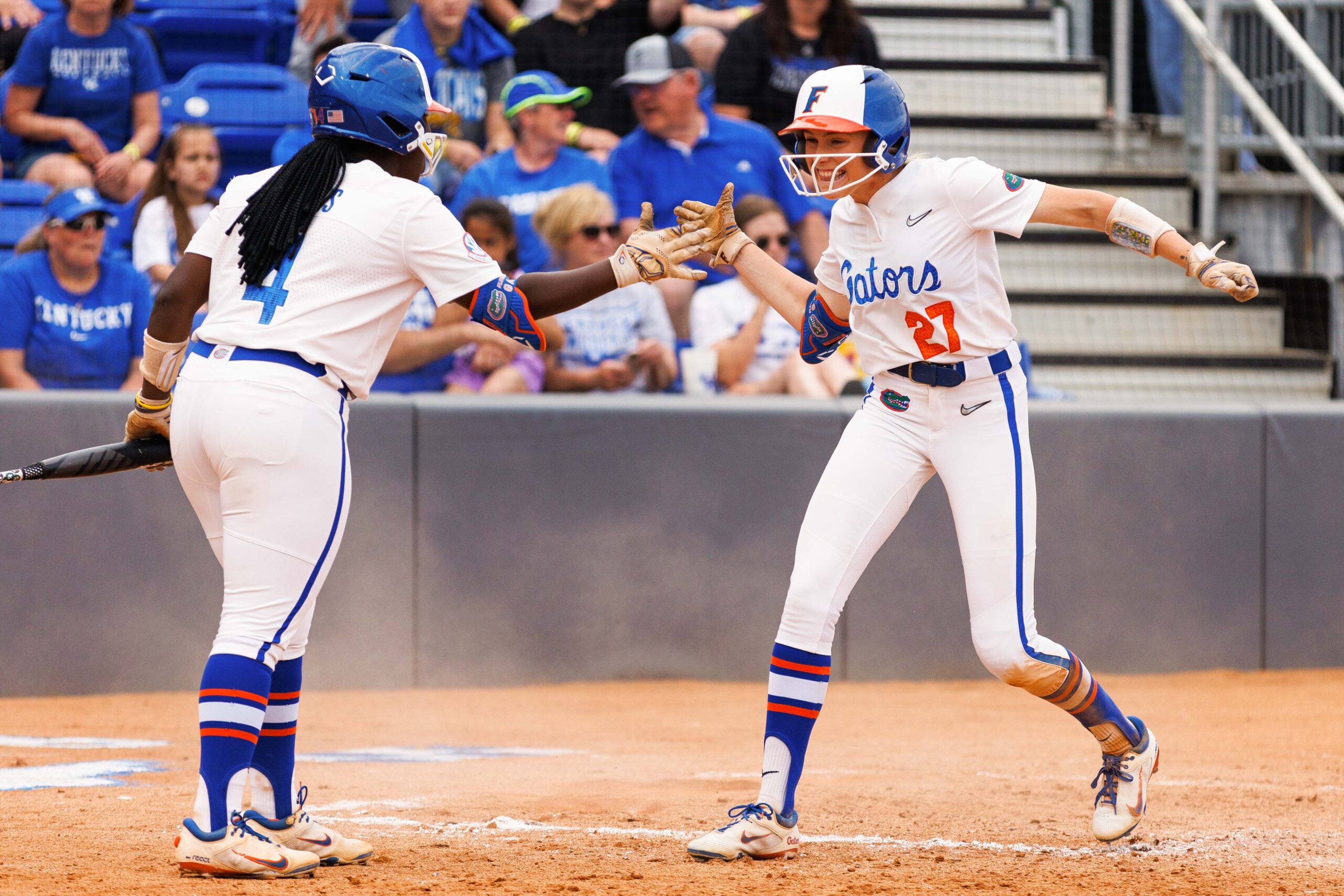 Florida Gators sophomore Kendra Falby celebrates a run with graduate student Charla Echols during the game against the Kentucky Wildcats on Saturday, May 6, 2023, at John Cropp Stadium in Lexington, Kentucky.