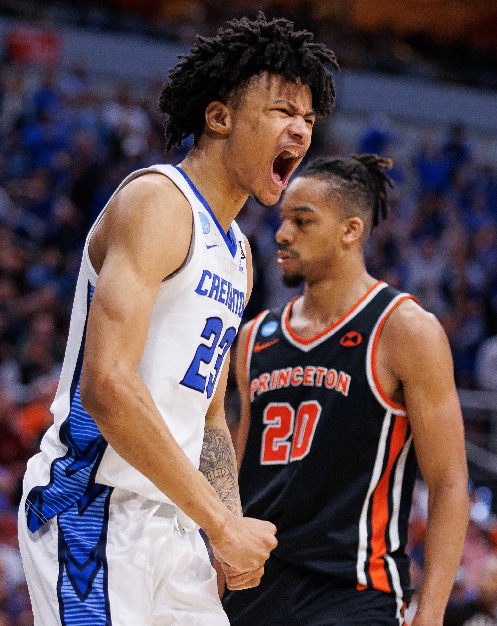 Mar 24, 2023; Louisville, KY, USA; Creighton Bluejays guard Trey Alexander (23) reacts after a play during the second half of the NCAA tournament round of sixteen against the Princeton Tigers at KFC YUM! Center. Mandatory Credit: Jordan Prather-USA TODAY Sports