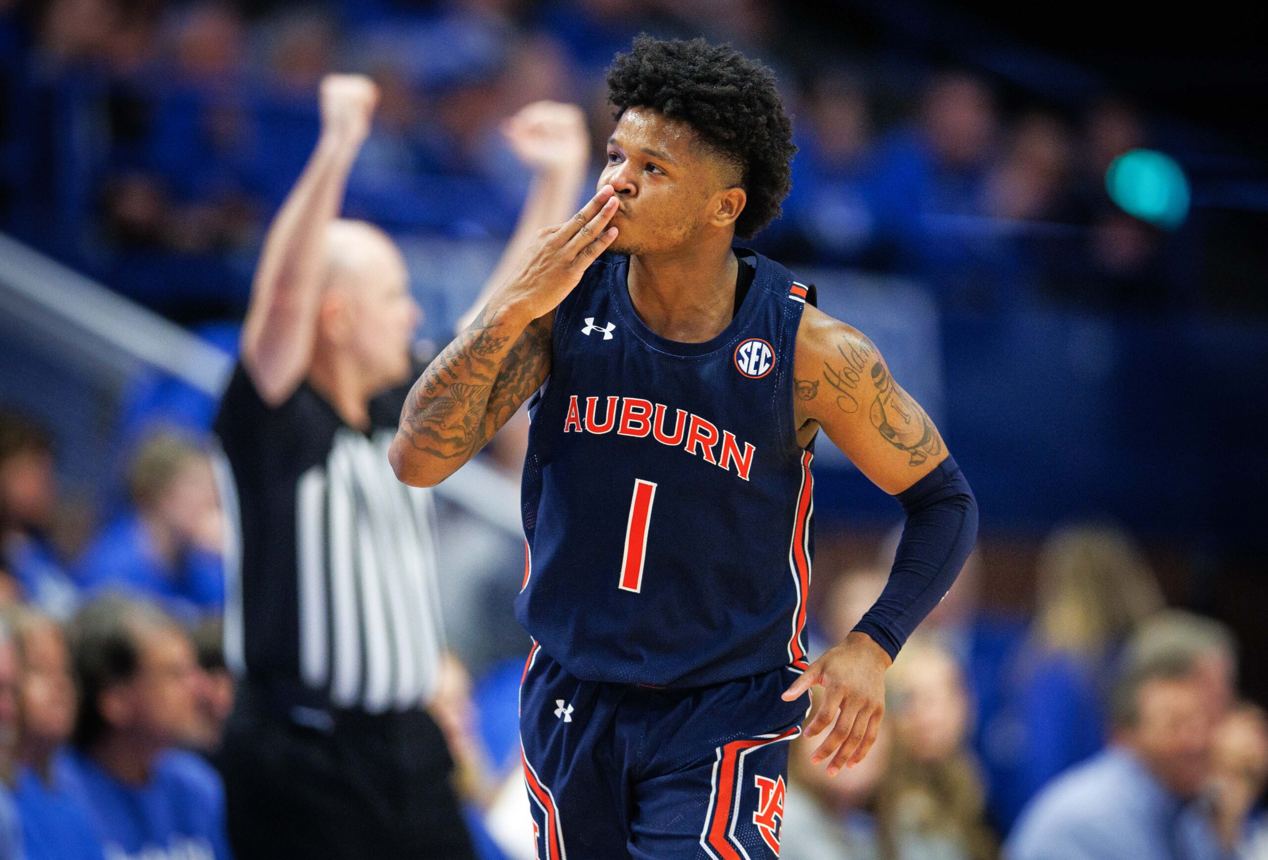 Feb 25, 2023; Lexington, Kentucky, USA; Auburn Tigers guard Wendell Green Jr. (1) celebrates a three point basket during the second half against the Kentucky Wildcats at Rupp Arena at Central Bank Center. Mandatory Credit: Jordan Prather-USA TODAY Sports